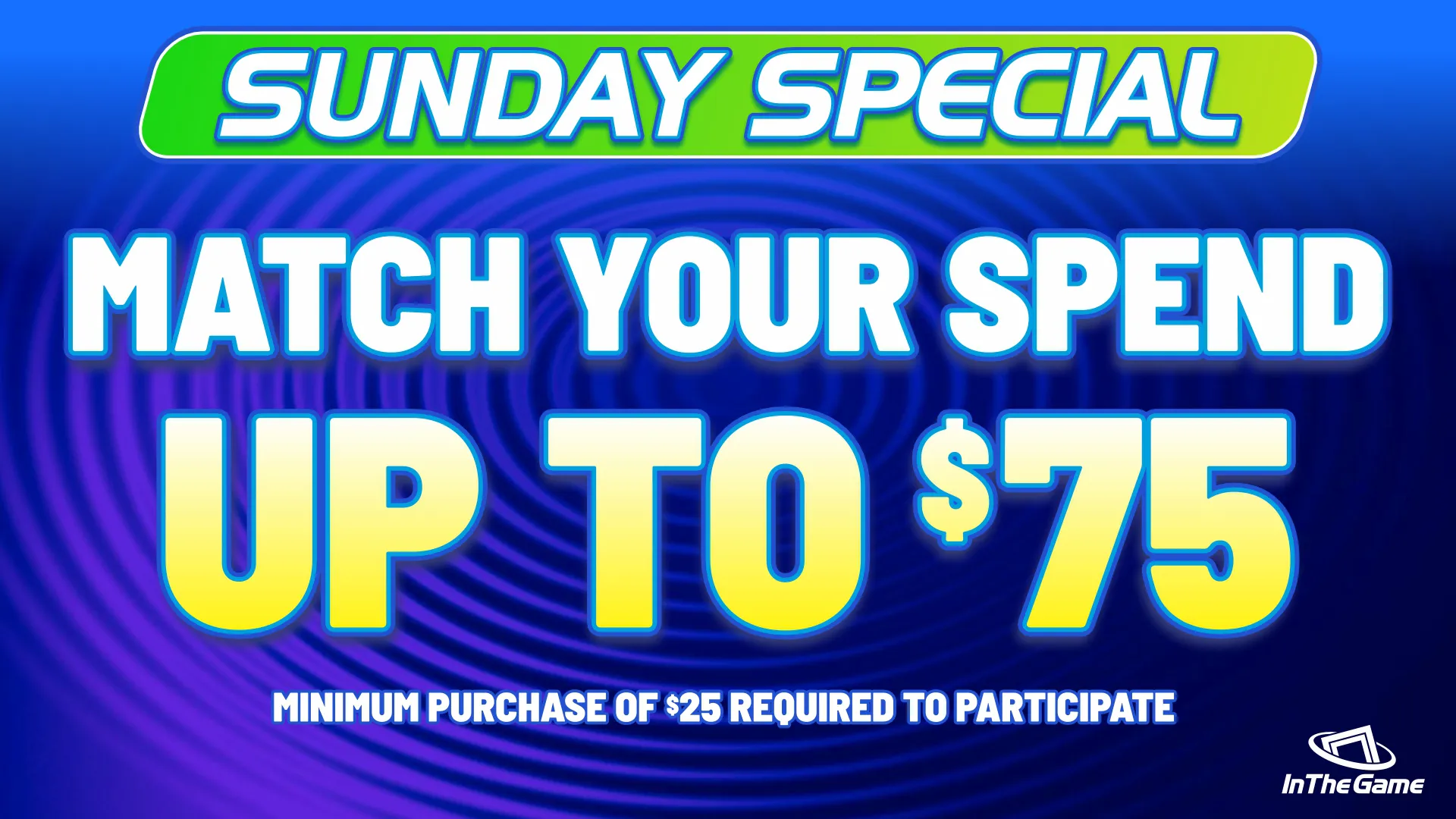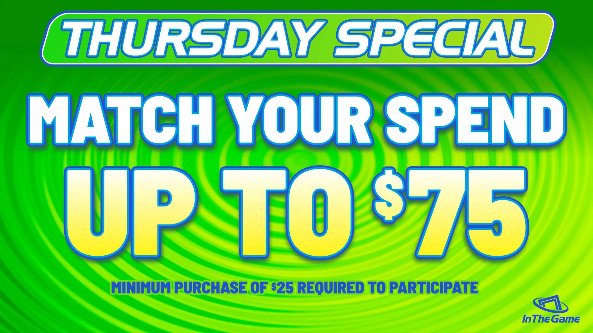Whatever you buy, we DOUBLE it, up to $75! BOGO Arcade Game Play, every Thursday & Sunday at In The Game.